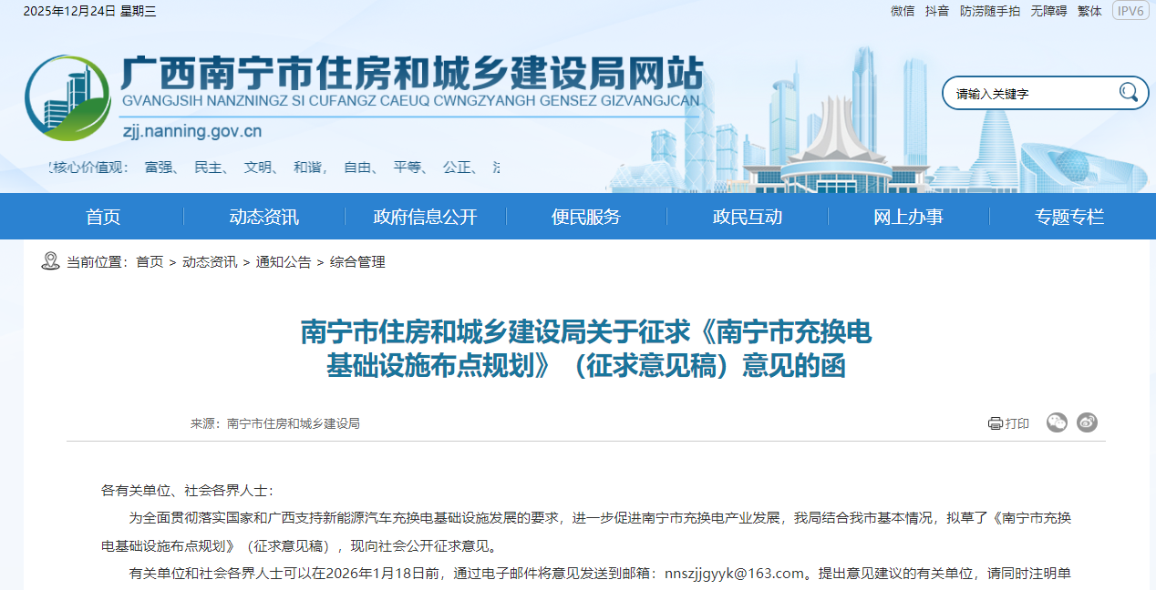 为全面贯彻落实国家和广西支持新能源汽车充换电基础设施发展的要求,加快推进南宁市新能源汽车的推广应用,按照国家“桩站先行、适度超前”的建设总要求科学布局充换电基础设施,加强与国土空间规划、电网规划及物业管理、城市停车等的统筹协调,构建满足需求、布局合理、功能完善、智能高效、使用便捷的充换电基础设施体系,科学确定充换电基础设施建设规模和空间布局,南宁市住房和城乡建设局结合南宁市基本情况,拟草了《南宁市充换电基础设施布点规划》(征求意见稿),现向社会公开征求意见。