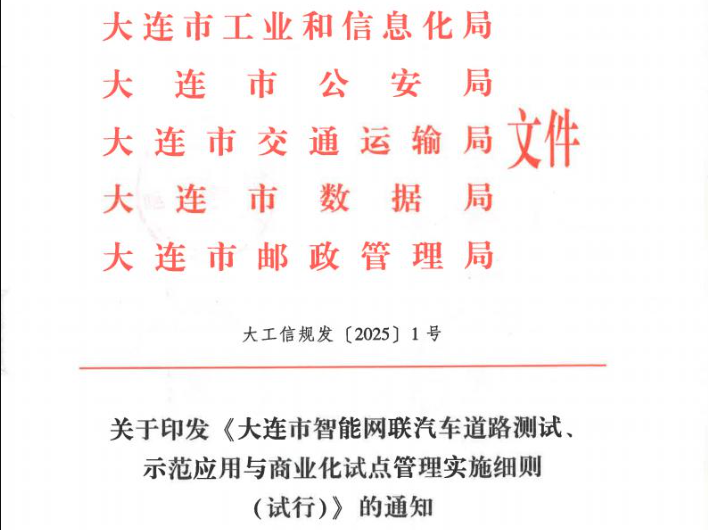 为加快大连市智慧交通体系建设,推动智能网联汽车应用和产业发展,指导和规范全市智能网联汽车道路测试与示范应用工作,依据有关法律法规,大连市工业和信息化局、公安局、交通运输局、数据局、邮政管理局联合制定《大连市智能网联汽车道路测试、示范应用与商业化试点管理实施细则(试行)》(以下简称《细则》)并于近日发布。《细则》明确: