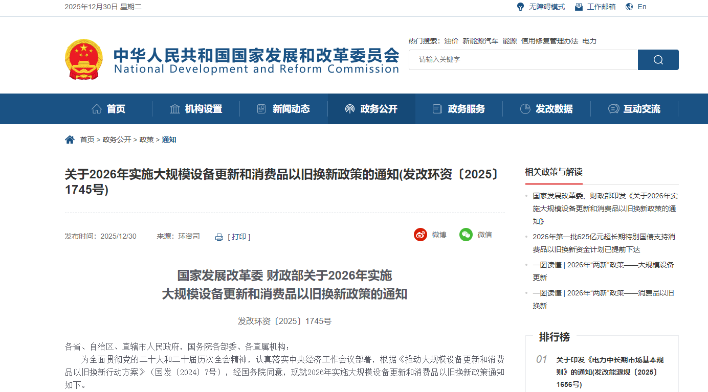 为全面贯彻党的二十大和二十届历次全会精神,认真落实中央经济工作会议部署,根据《推动大规模设备更新和消费品以旧换新行动方案》(国发〔2024〕7号),经国务院同意,国家发展改革委、财政部联合发布《2026年实施大规模设备更新和消费品以旧换新政策》(以下简称《政策》)并于12月30日发布。《政策》明确: