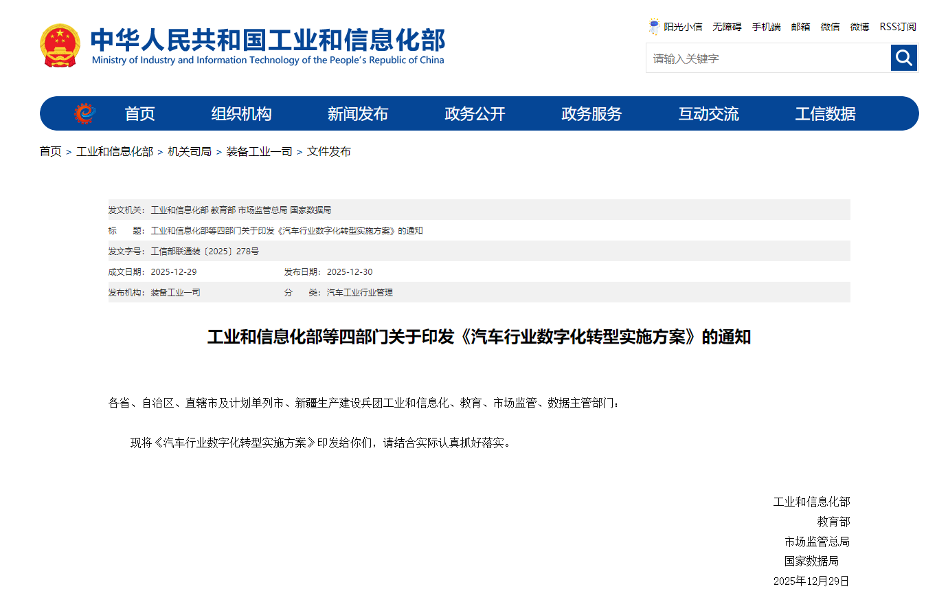 汽车产业是国民经济的重要支柱产业,产业链长、涉及面广、关联带动性强,是制造业数字化转型的重点领域。近年来,我国汽车行业数字化转型持续深化,加速向数字化、网络化、智能化演进,但仍存在顶层设计不足、数据要素应用不充分、零部件中小企业转型较慢等问题。为落实《制造业数字化转型行动方案》,推动汽车行业数字化转型、智能化升级,加快推进新型工业化,培育形成新质生产力,工业和信息化部、教育部、市场监管总局、国家数据局联合制定《汽车行业数字化转型实施方案》(以下简称《方案》)并于12月30日发布。《方案》明确: