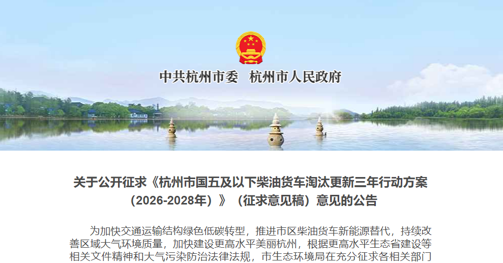 为加快交通运输结构绿色低碳转型,推进市区柴油货车新能源替代,持续改善区域大气环境质量,加快建设更高水平美丽杭州,根据更高水平生态省建设等相关文件精神和大气污染防治法律法规,杭州市生态环境局在充分征求各相关部门(单位)意见的基础上,代拟了《杭州市国五及以下柴油货车淘汰更新三年行动方案(2026-2028年)(征求意见稿)》并于近日发布。《征求意见》明确:不断优化各类配套扶持政策。