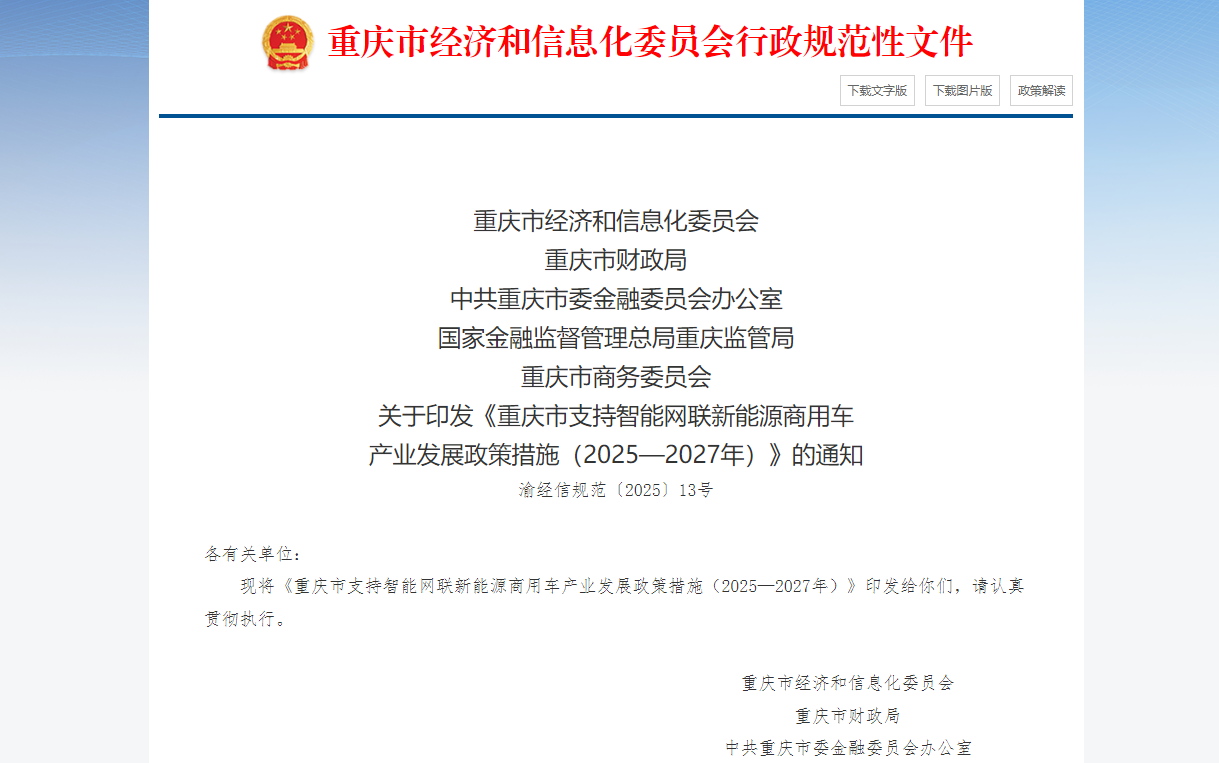 近日,重庆市经济和信息化委员会、重庆市财政局、中共重庆市委金融委员会办公室、国家金融监督管理总局重庆监管局、重庆市商务委员会联合出台《重庆市支持智能网联新能源商用车产业发展政策措施(2025—2027年)》。