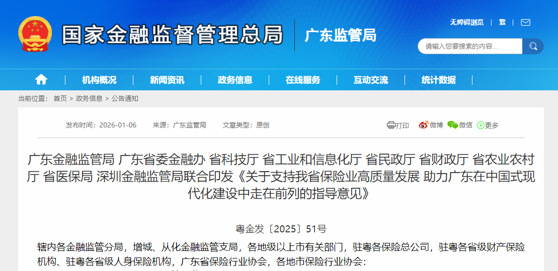 广东金融监管局 广东省委金融办 省科技厅 省工业和信息化厅 省民政厅 省财政厅 省农业农村厅 省医保局 深圳金融监管局联合印发《关于支持我省保险业高质量发展 助力广东在中国式现代化建设中走在前列的指导意见》,《意见》明确: