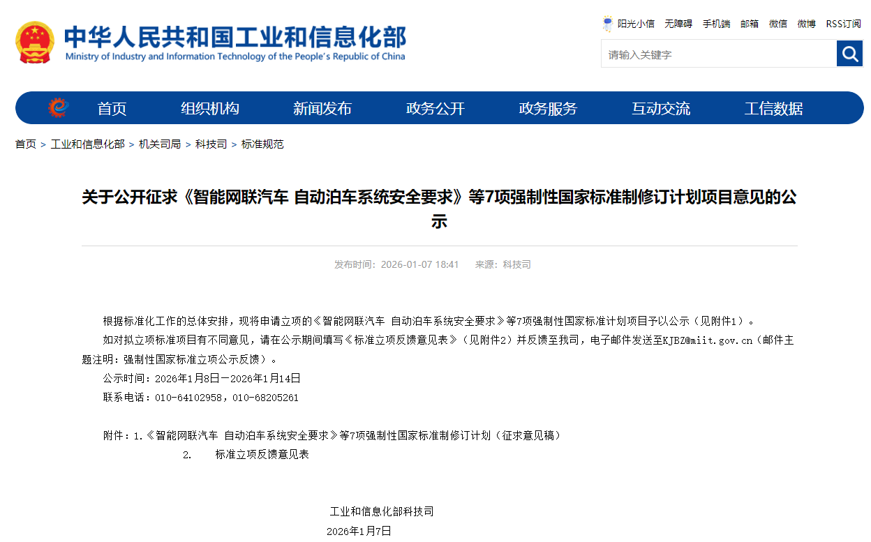 根据标准化工作的总体安排,工业和信息化部科技司现将申请立项的《智能网联汽车 自动泊车系统安全要求》《智能网联汽车 安全事件数据交互与管理系统技术规范》强制性国家标准计划项目予以公示。标准项目信息,性质:强制;制修订:制定;项目周期:22个月;委托标准化技术委员:全国汽车标准化技术委员会。