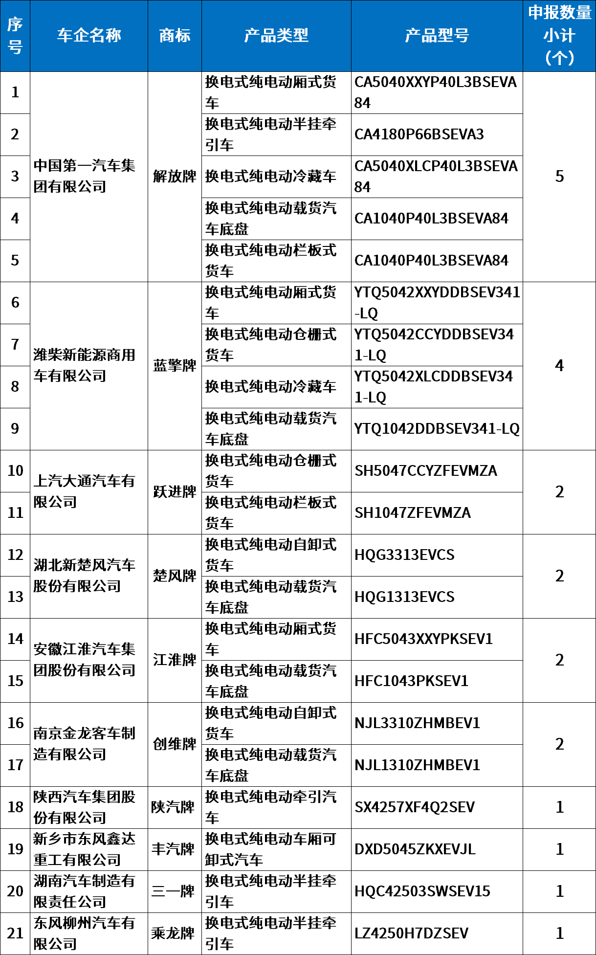 3、换电式产品:本批次公示的换电式纯电动产品共有10家企业21个型号申报(含专用车16个;专用车底盘5个)。