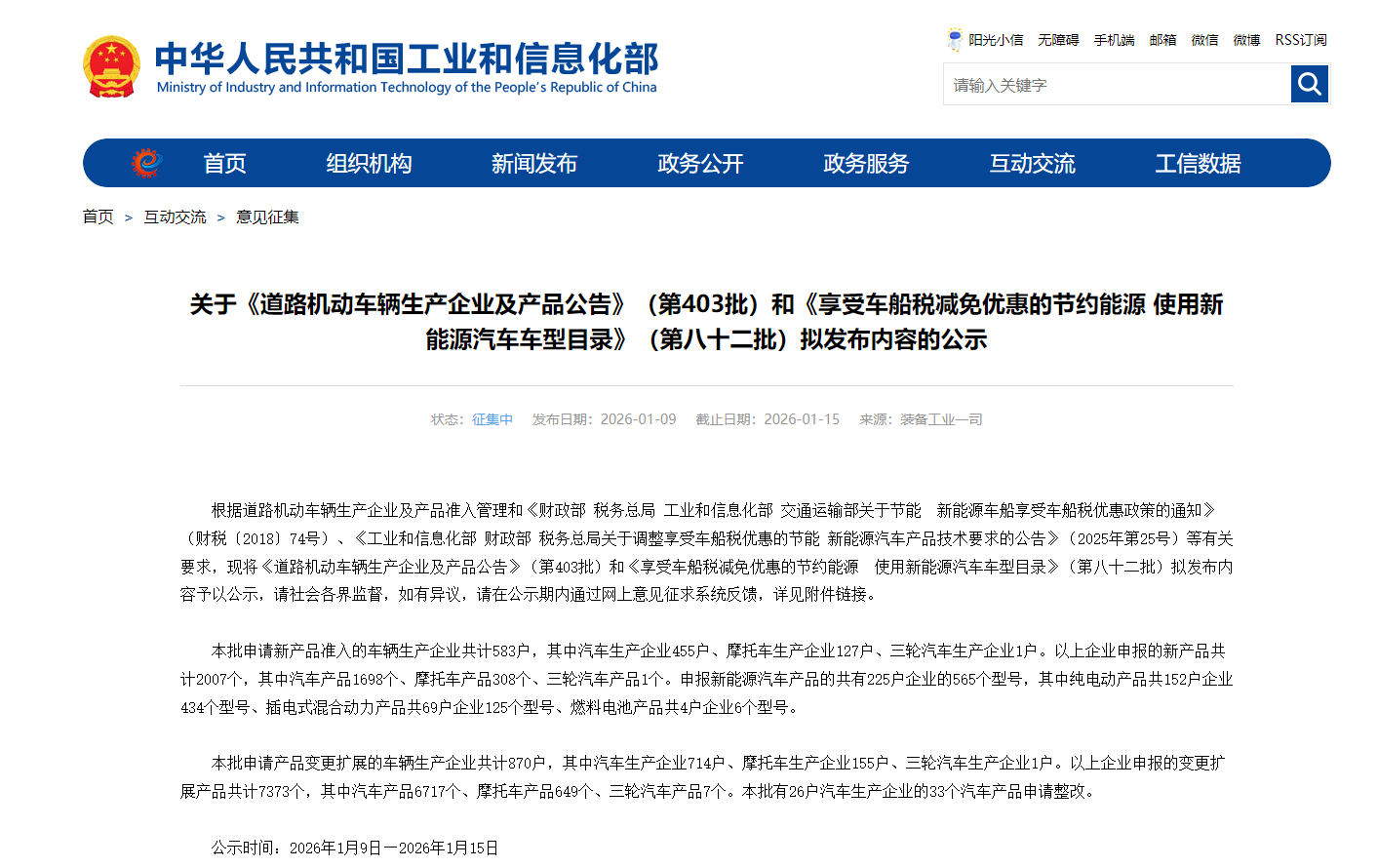 根据道路机动车辆生产企业及产品准入管理和《财政部 税务总局 工业和信息化部 交通运输部关于节能 新能源车船享受车船税优惠政策的通知》(财税〔2018〕74号)、《工业和信息化部 财政部 税务总局关于调整享受车船税优惠的节能 新能源汽车产品技术要求的公告》(2025年第25号)等有关要求,现将《道路机动车辆生产企业及产品公告》(第403批)和《享受车船税减免优惠的节约能源 使用新能源汽车车型目录》(第八十二批)拟发布内容予以公示,请社会各界监督,如有异议,请在公示期内通过网上意见征求系统反馈,详见附件链接。