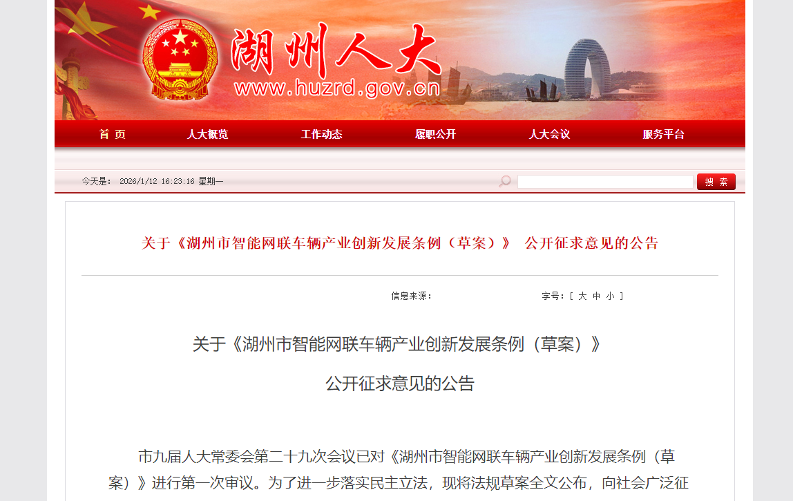 为了推进智能网联车辆产业发展,规范和促进智能网联车辆创新应用活动,保障道路交通安全,加快培育新质生产力,根据有关法律、法规,结合本市实际,湖州市人大常委会法制工作委员会制定《湖州市智能网联车辆产业创新发展条例(草案)》,为了进一步落实民主立法,现将法规草案全文公布,向社会广泛征求意见。
