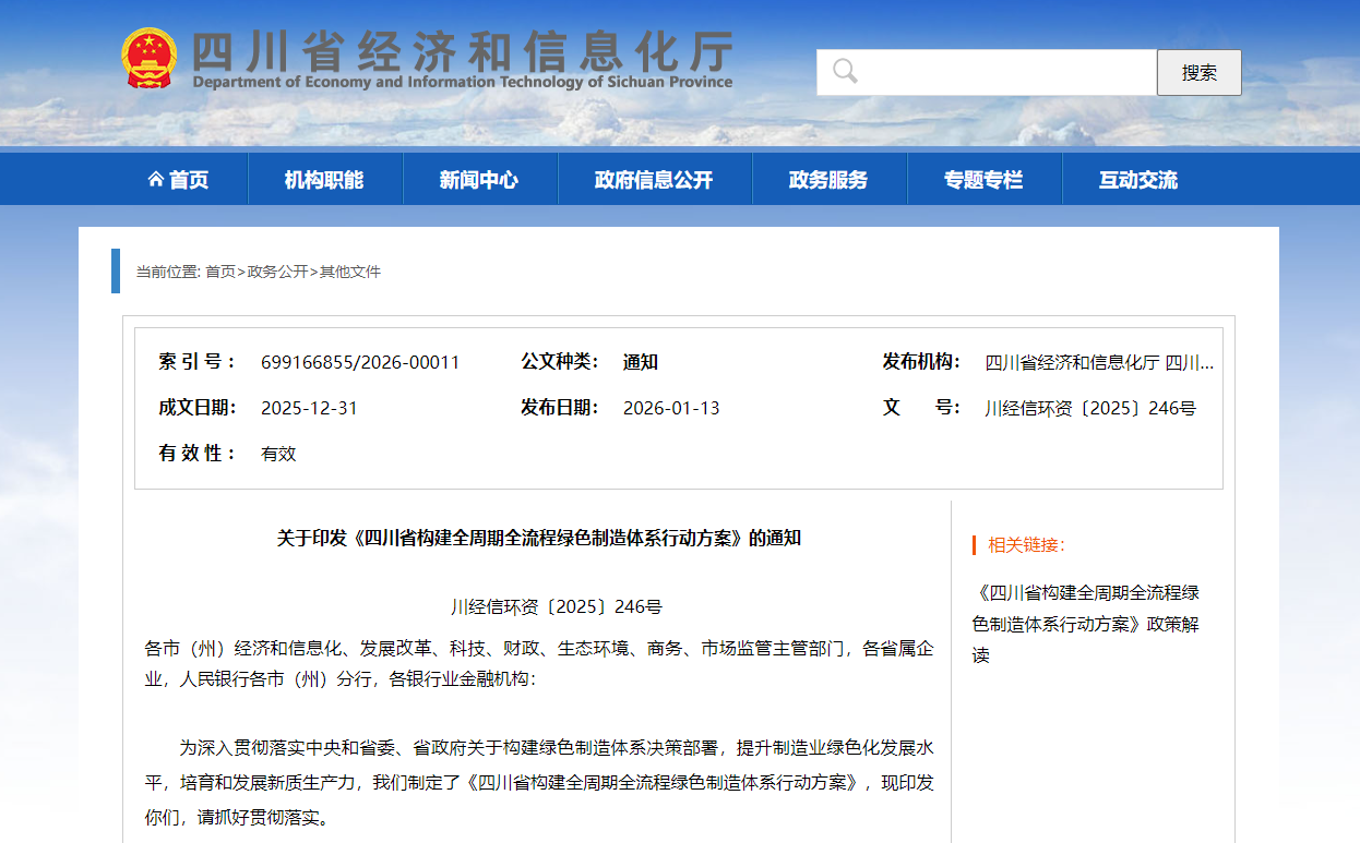 1月13日,四川省经信厅、发改委等9部门联合发布《四川省构建全周期全流程绿色制造体系行动方案》,《方案》明确: