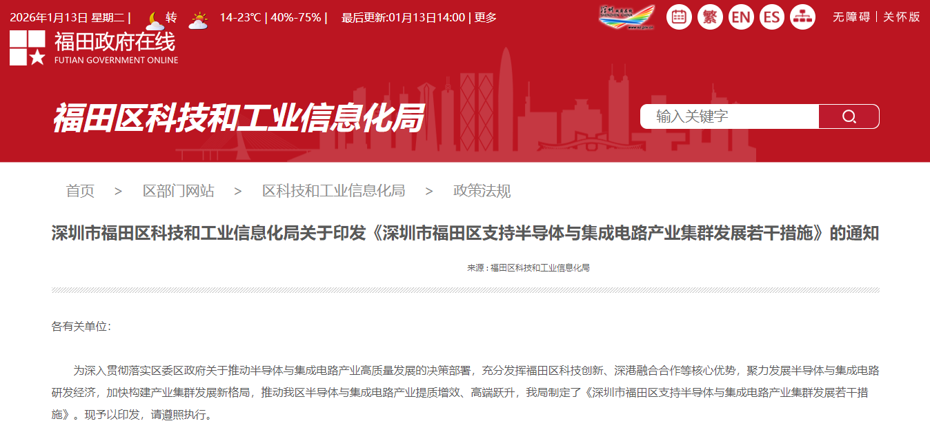 半导体与集成电路作为战略性新兴产业的核心支柱,其自主可控发展对国家科技安全和产业竞争力至关重要。为深入贯彻落实区委区政府关于推动半导体与集成电路产业高质量发展的决策部署,充分发挥福田区科技创新、深港融合合作等核心优势,聚力发展半导体与集成电路研发经济,加快构建产业集群发展新格局,推动我区半导体与集成电路产业提质增效、高端跃升,深圳市福田区科技和工业信息化局制定《深圳市福田区支持半导体与集成电路产业集群发展若干措施》(以下简称《措施》)。《措施》明确: