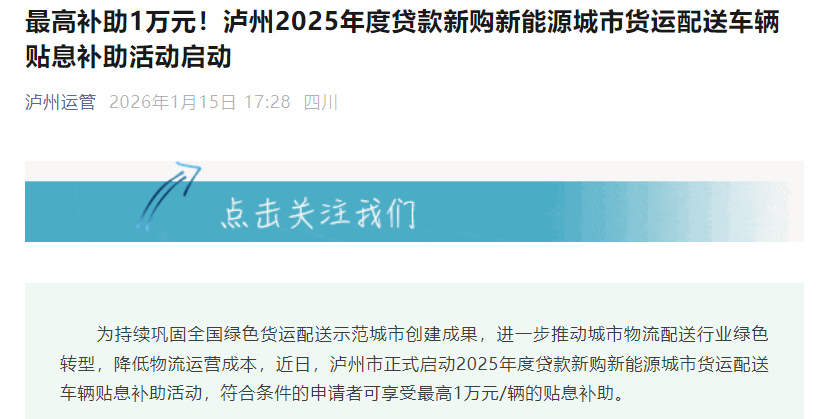 为持续巩固全国绿色货运配送示范城市创建成果,进一步推动城市物流配送行业绿色转型,降低物流运营成本,泸州市正式启动2025年度贷款新购新能源城市货运配送车辆贴息补助活动,符合条件的申请者可享受最高1万元/辆的贴息补助。