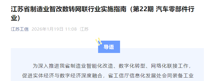 汽车零部件作为汽车产业的关键环节,涵盖发动机、变速器、车身、底盘、电子系统等众多产品,其研发与制造流程复杂且精密,涉及大量加工、装配及质量管控环节。为深入推进江苏省制造业智能化改造、数字化转型、网络化联接工作,促进实体经济与数字经济深度融合,江苏省工信厅信息化发展处会同装备工业一处、装备工业二处等相关处室,牵头组织专业力量编制完成江苏省制造业智改数转网联汽车零部件行业实施指南。