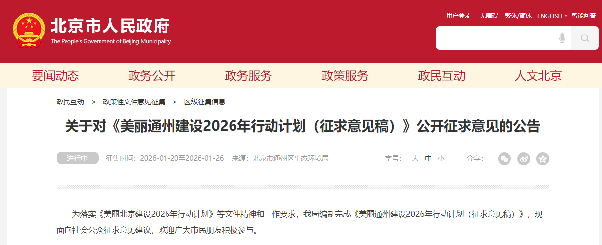 为落实《美丽北京建设2026年行动计划》等文件精神和工作要求,北京市通州区生态环境局编制完成《美丽通州建设2026年行动计划(征求意见稿)》,现面向社会公众征求意见建议。