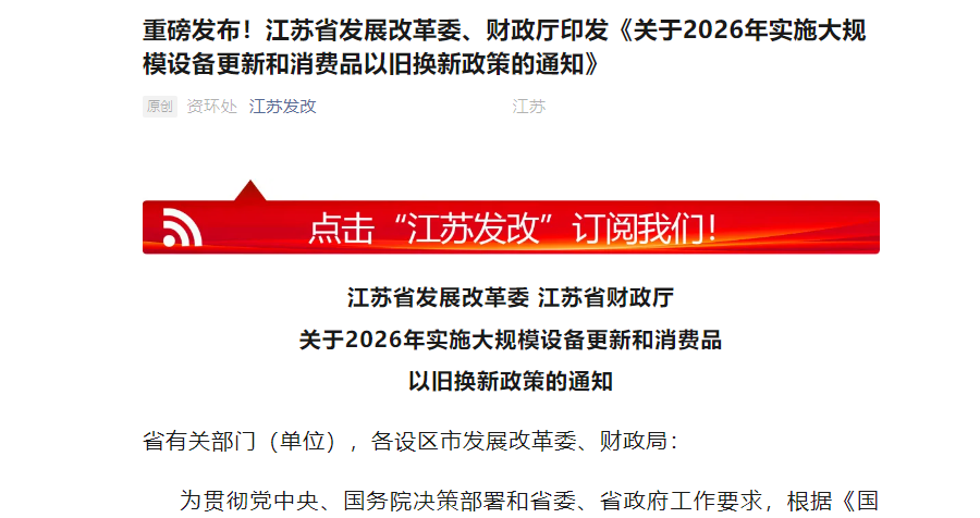为贯彻党中央、国务院决策部署和省委、省政府工作要求,江苏省发展改革委 江苏省财政厅联合制定《关于2026年实施大规模设备更新和消费品以旧换新政策的通知》(以下简称《通知》)并于近日印发。《通知》明确: