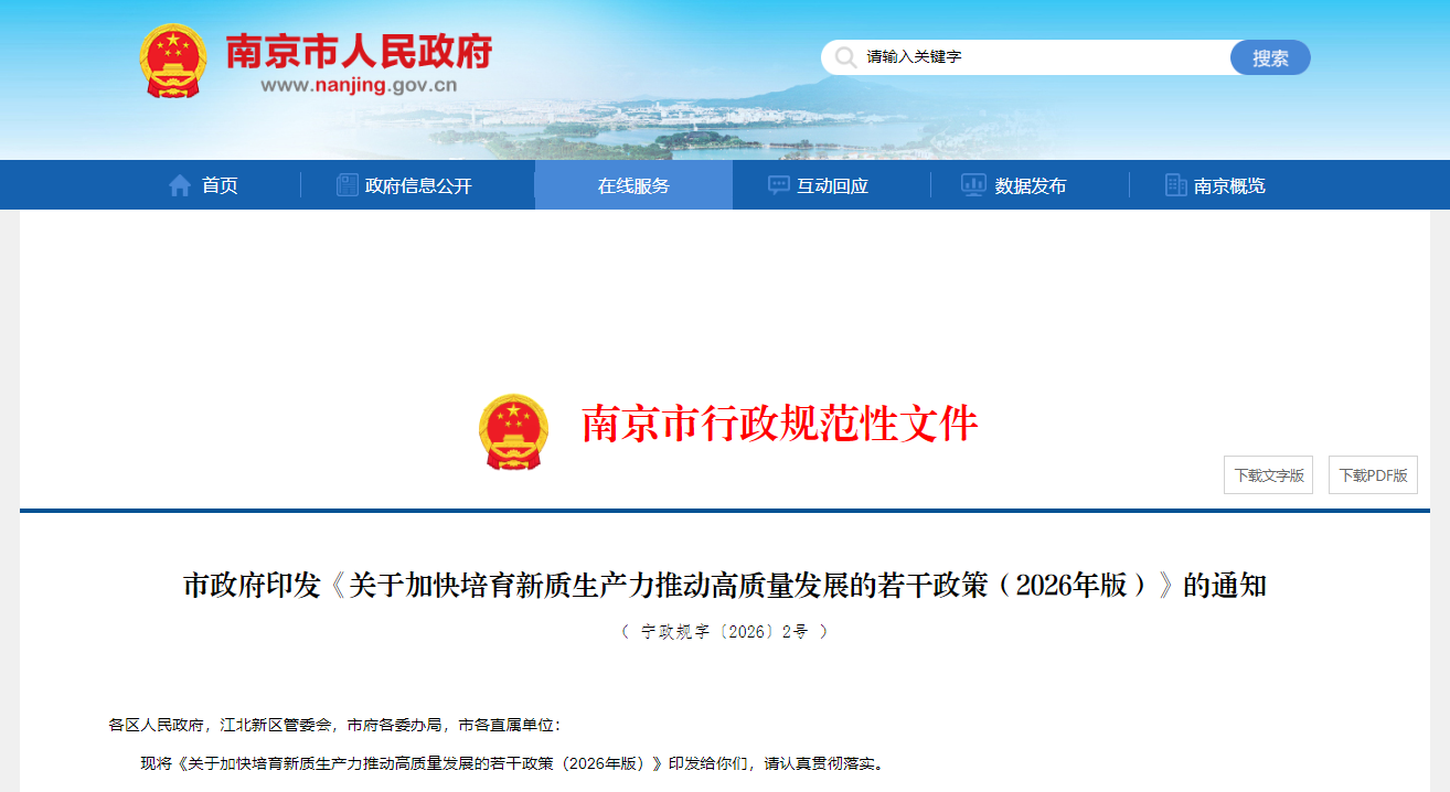 为深入贯彻落实党的二十届四中全会精神,结合本市实际加快培育新质生产力,进一步激发经营主体活力、增强内生发展动力,推动“十五五”实现良好开局、高质量发展取得更大成效,南京市人民政府制定《关于加快培育新质生产力推动高质量发展的若干政策(2026年版)》(以下简称《若干政策》)并于近日发布。《若干政策》明确: