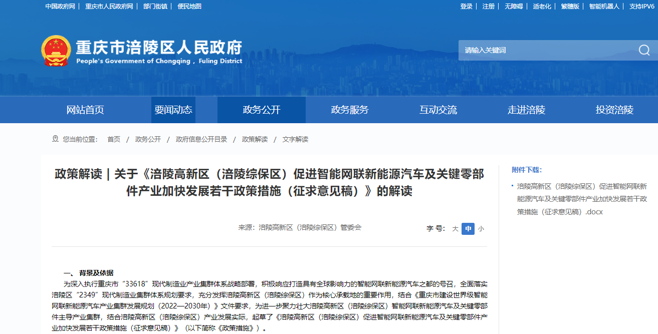 为深入执行重庆市“33618”现代制造业产业集群体系战略部署,积极响应打造具有全球影响力的智能网联新能源汽车之都的号召,全面落实涪陵区“2349”现代制造业集群体系规划要求,充分发挥涪陵高新区(涪陵综保区)作为核心承载地的重要作用,结合《重庆市建设世界级智能网联新能源汽车产业集群发展规划(2022—2030年)》文件要求,为进一步聚力壮大涪陵高新区(涪陵综保区)智能网联新能源汽车及关键零部件主导产业集群,结合涪陵高新区(涪陵综保区)产业发展实际,涪陵高新区(涪陵综保区)管委会制定《促进智能网联新能源汽车及关键零部件产业加快发展若干政策措施(征求意见稿)》。