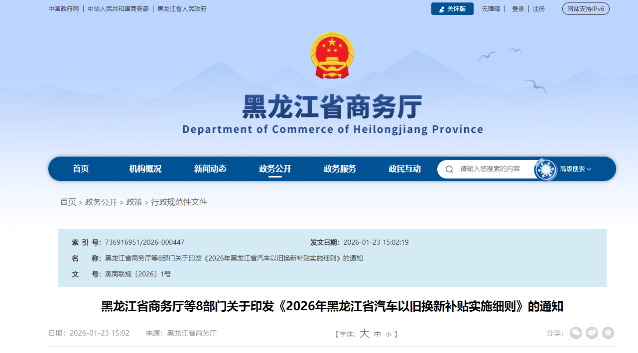 为释放汽车消费潜力、实施好2026年黑龙江省汽车以旧换新补贴政策, 黑龙江省商务厅等8部门现将《2026年黑龙江省汽车以旧换新补贴实施细则》(以下简称《细则》)印发。