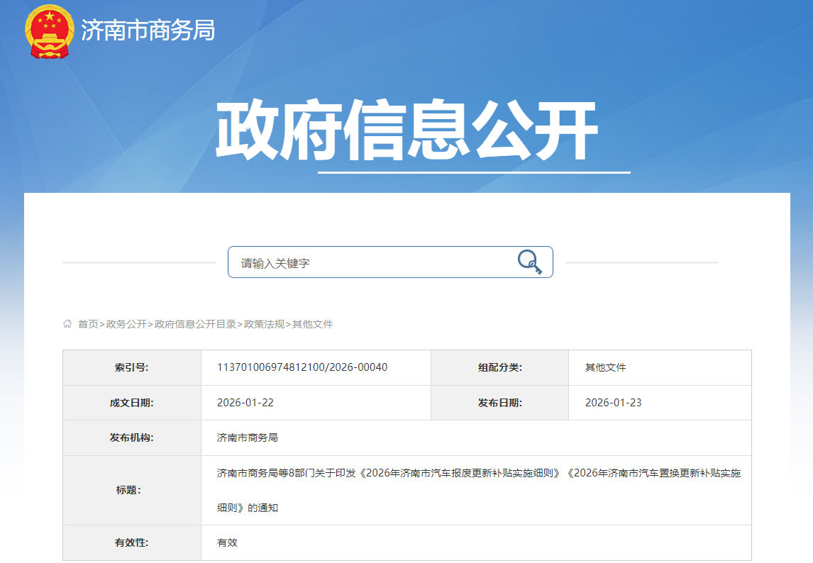 济南市商务局等8部门联合发布《2026年济南市汽车报废更新补贴实施细则》《2026年济南市汽车置换更新补贴实施细则》,《细则》明确: