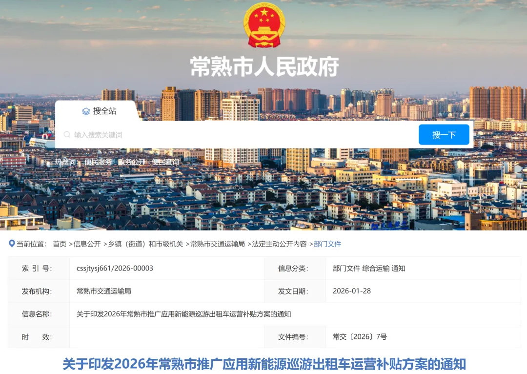 为深入贯彻落实中央及省、市关于碳达峰、碳中和重大决策部署,推动常熟市巡游出租车能源结构转型升级并贯彻落实相关文件精神,加快市区新能源巡游出租车推广应用,根据《苏州市区推广应用新能源巡游出租车运营补贴方案》的通知,常熟市交通运输局、财政局、工业和信息化局研制《常熟市推广应用新能源巡游出租车运营补贴方案》(以下简称《方案》)并于近日发布。