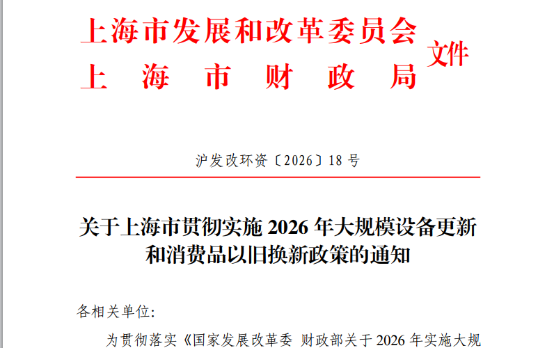 为贯彻落实《国家发展改革委 财政部关于2026年实施大规模设备更新和消费品以旧换新政策的通知》(发改环资〔2025〕1745号)和《上海市推动大规模设备更新和消费品以旧换新行动计划(2024-2027年)》(沪府发〔2024〕5号),经市政府同意,结合本市实际就相关工作通知如下: