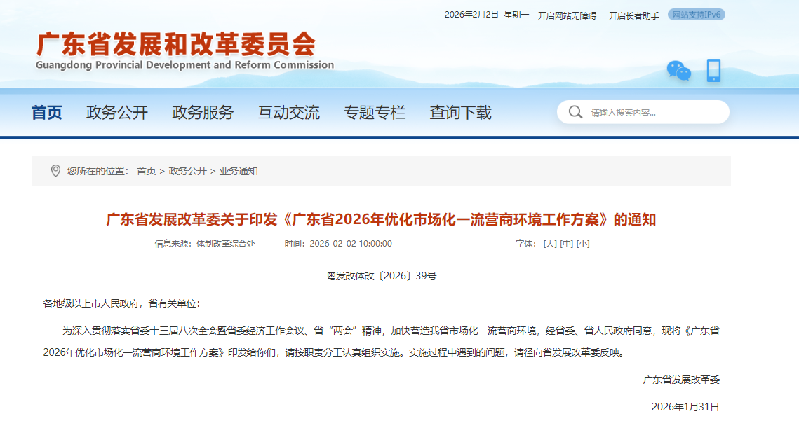 广东省发展改革委印发《广东省2026年优化市场化一流营商环境工作方案》,《方案》明确:
