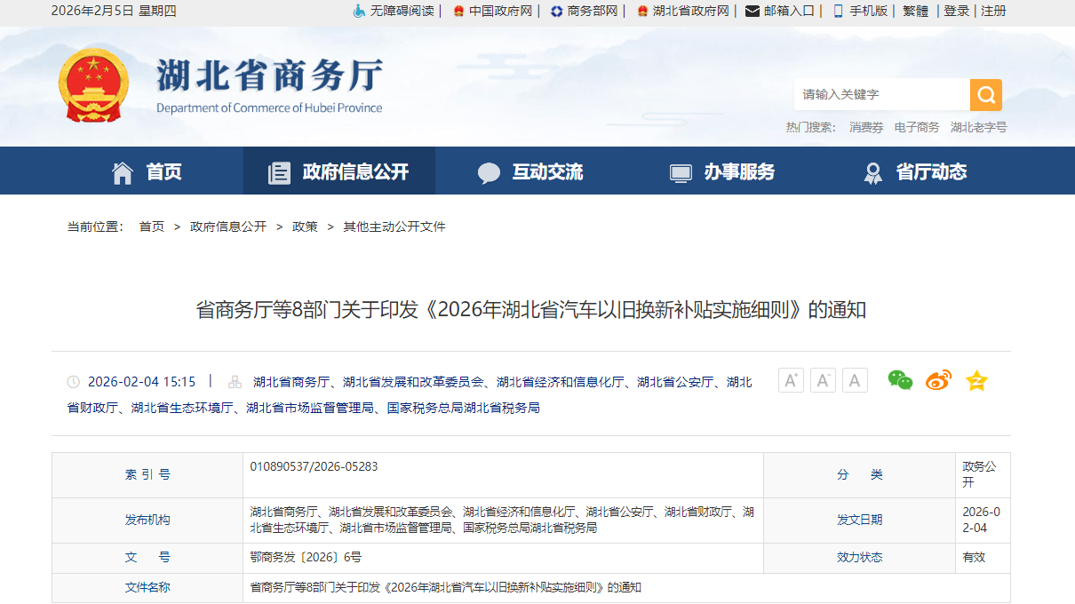 按照相关文件要求,为更好实施2026年湖北省汽车以旧换新补贴政策,湖北省商务厅等8部门联合印发《2026年湖北省汽车以旧换新补贴实施细则》(以下简称《细则》)。《细则》明确:
