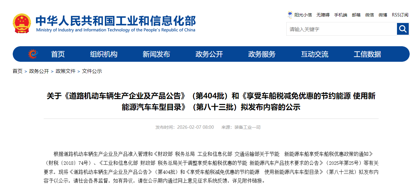 根据道路机动车辆生产企业及产品准入管理和《财政部 税务总局 工业和信息化部 交通运输部关于节能 新能源车船享受车船税优惠政策的通知》(财税〔2018〕74号)、《工业和信息化部 财政部 税务总局关于调整享受车船税优惠的节能 新能源汽车产品技术要求的公告》(2025年第25号)等有关要求,现将《道路机动车辆生产企业及产品公告》(第404批)和《享受车船税减免优惠的节约能源 使用新能源汽车车型目录》(第八十三批)拟发布内容予以公示,请社会各界监督,如有异议,请在公示期内通过网上意见征求系统反馈,详见附件链接。
