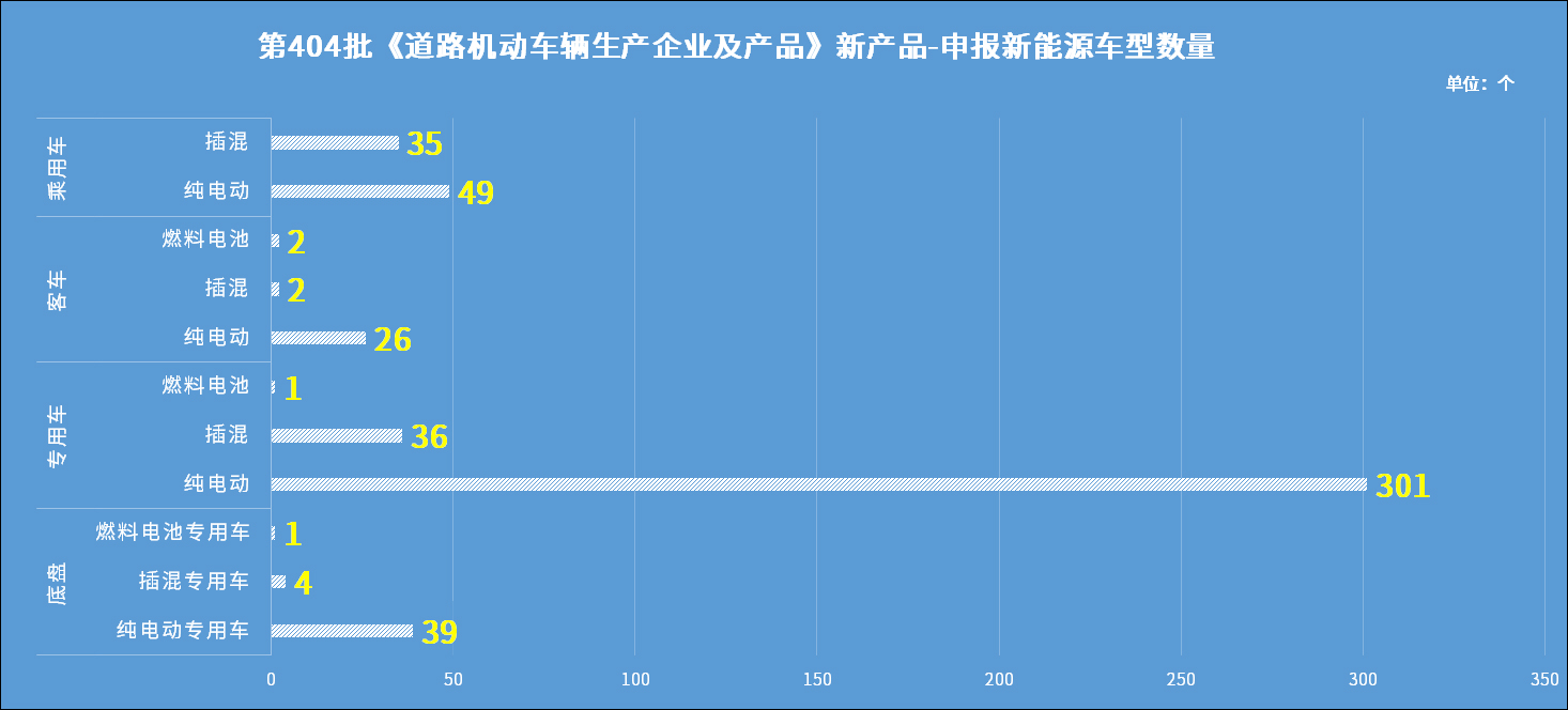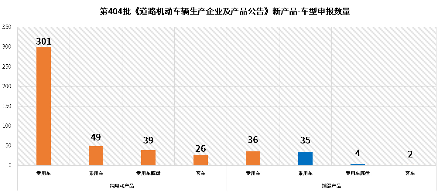 工业和信息化部装备工业一司公示申报的第404批《道路机动车辆生产企业及产品公告》新产品。经统计,申报新能源汽车产品的共有166家企业的496个型号,其中纯电动产品共143家企业415个型号、插电式混合动力产品共41家企业77个型号、燃料电池产品共3家企业4个型号。