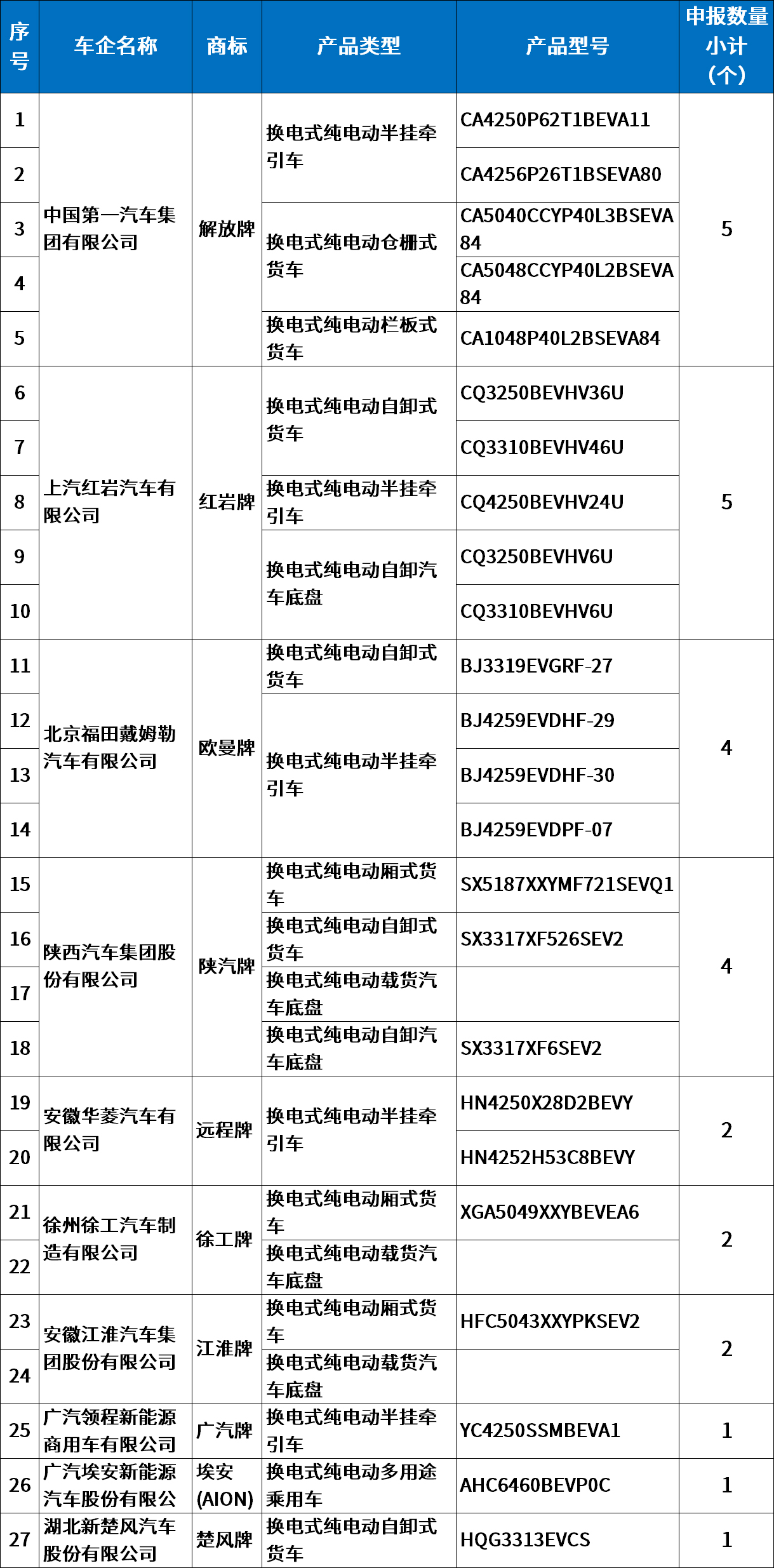 3、换电式产品:本批次公示的换电式纯电动产品共有10家企业27个型号申报(含乘用车1个;专用车20个;专用车底盘6个)。