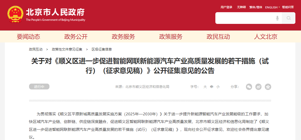 为贯彻落实《顺义区平原新城高质量发展实施方案(2025年—2030年)》关于进一步提升新能源智能汽车产业发展能级的工作要求,加快区域汽车产业链、创新链、供应链深度融合,促进顺义区智能网联新能源汽车产业高质量发展,北京市顺义区经济和信息化局制定了《顺义区进一步促进智能网联新能源汽车产业高质量发展的若干措施(试行)(征求意见稿)》,现向社会公开征求意见。