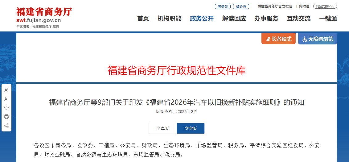 福建省商务厅等9部门印发《福建省2026年汽车以旧换新补贴实施细则》,《细则》明确: