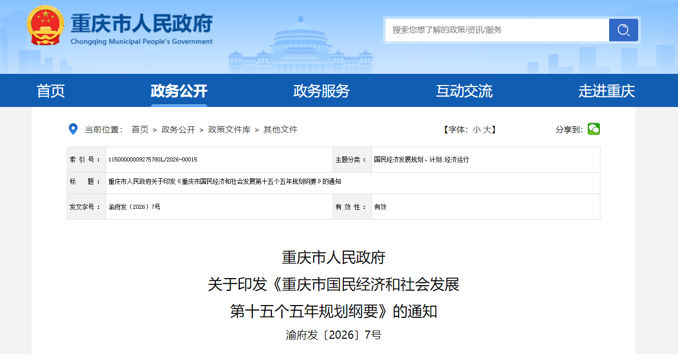 重庆市人民政府印发《重庆市国民经济和社会发展第十五个五年规划纲要》,《纲要》明确:打造具有全球影响力的智能网联新能源汽车之都。