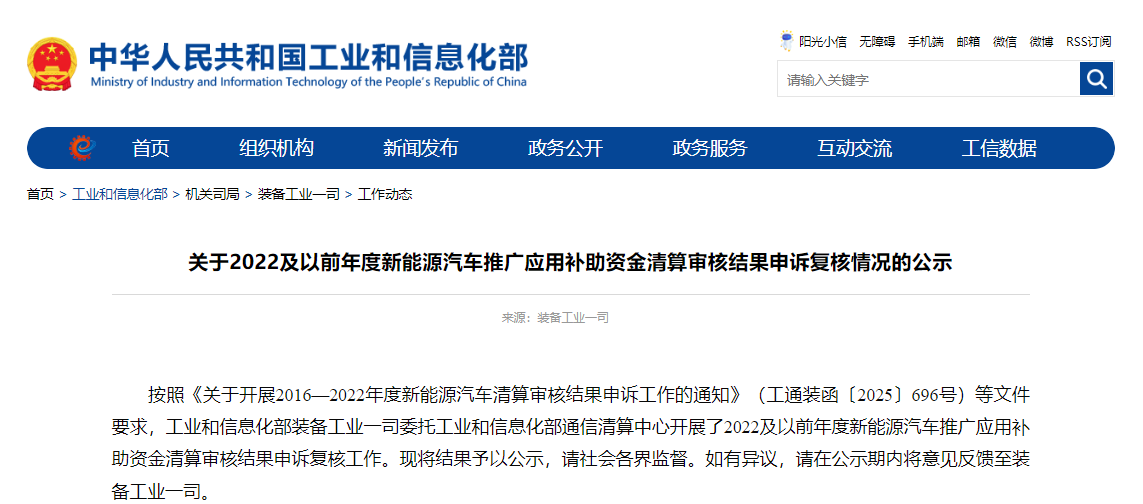 按照《关于开展2016—2022年度新能源汽车清算审核结果申诉工作的通知》(工通装函〔2025〕696号)等文件要求,工业和信息化部装备工业一司委托工业和信息化部通信清算中心开展了2022及以前年度新能源汽车推广应用补助资金清算审核结果申诉复核工作。现将结果予以公示,请社会各界监督。