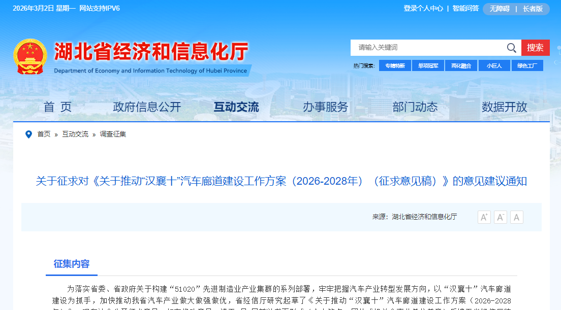 为落实省委、省政府关于构建“51020”先进制造业产业集群的系列部署,牢牢把握汽车产业转型发展方向,以“汉襄十”汽车廊道建设为抓手,加快推动我省汽车产业做大做强做优,湖北省经信厅研究起草《关于推动“汉襄十”汽车廊道建设工作方案(2026-2028年)征求意见》并于近日发布。《征求意见》明确:拓展多维应用场景,提升产业吸附力。