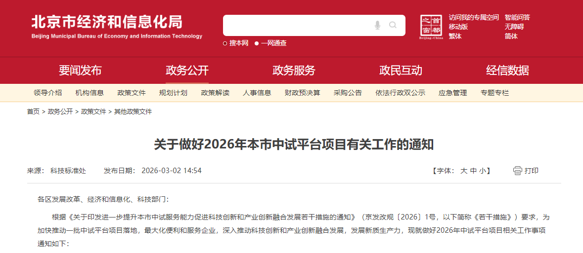 根据相关文件要求,为加快推动一批中试平台项目落地,最大化便利和服务企业,深入推动科技创新和产业创新融合发展,北京市发改委、经信局等部门现开展2026年北京市中试平台项目申报工作,并发布《关于做好2026年本市中试平台项目有关工作的通知》。《通知》明确: