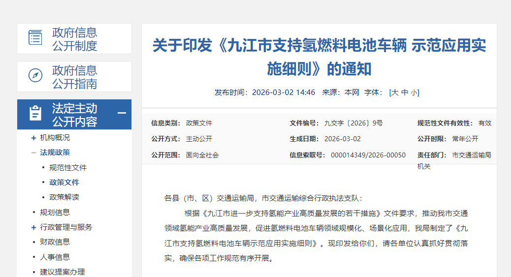 根据相关文件要求,为推动九江市交通领域氢能产业高质量发展,促进氢燃料电池车辆领域规模化、场景化应用,九江市交通运输局制定了《九江市支持氢燃料电池车辆示范应用实施细则》并于近日印发。