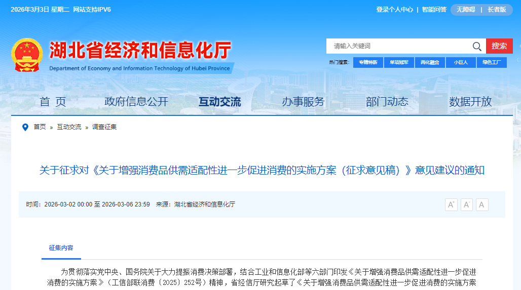为深入贯彻党的二十大和二十届历届全会精神,认真落实省委省政府大力提振消费工作部署,坚持以新需求引领新供给、以新供给创造新需求,紧盯功能消费与新型消费,持续增强供需适配性和平衡性,力争3—5年培育形成3个5千亿级消费领域和5个千亿级消费热点,不断释放湖北制造能力和消费潜力,湖北省经信厅等六部门制定《关于增强消费品供需适配性进一步促进消费的实施方案(2026—2028年)(征求意见稿)》并于近日发布。《征求意见》明确: