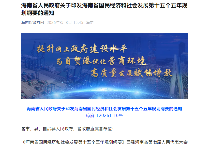 “十五五”时期是我国基本实现社会主义现代化夯实基础、全面发力的关键时期,也是海南自由贸易港在全岛封关新起点上全面深化改革开放、实现高质量发展的关键五年。近日,海南省人民政府印发《海南省国民经济和社会发展第十五个五年规划纲要》(以下简称《纲要》),《纲要》系统阐明省委省政府战略意图,明确经济社会发展的总体思路、具体目标、主要任务和重大举措。