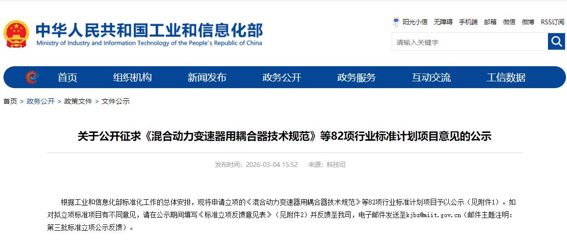 根据工业和信息化部标准化工作的总体安排,工业和信息化部科技司现将申请立项的《混合动力变速器用耦合器技术规范》等行业标准计划项目予以公示。