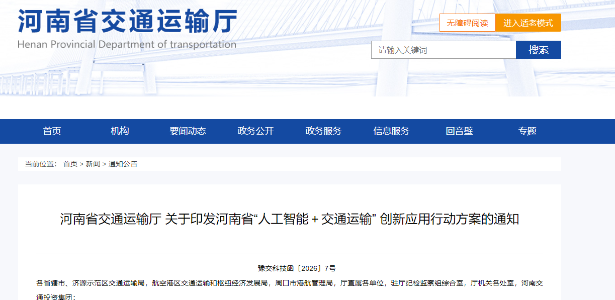 为深入贯彻党中央、国务院关于加快发展新一代人工智能的决策部署,全面落实交通运输部等七部委《关于“人工智能+交通运输”的实施意见》精神,积极响应省级战略要求,推动人工智能在省交通运输领域的融合创新与规模应用,加速行业数智化转型进程,培育壮大交通领域新质生产力,河南省交通运输厅制定《河南省“人工智能+交通运输”创新应用行动方案》(以下简称《方案》)并于近日印发。