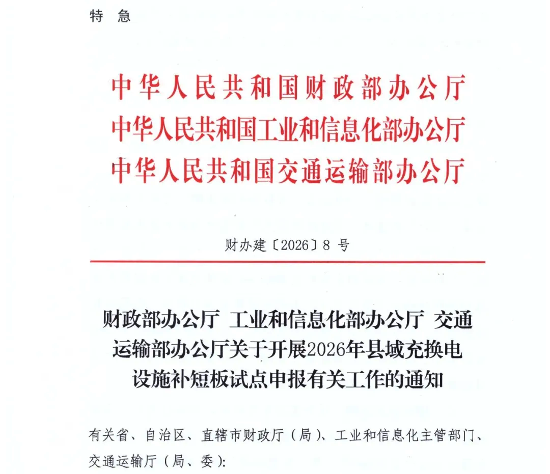 财政部办公厅、工业和信息化部办公厅、交通运输部办公厅联合发布《关于开展2026年县域充换电设施补短板试点报有关工作的通知》,《通知》明确: