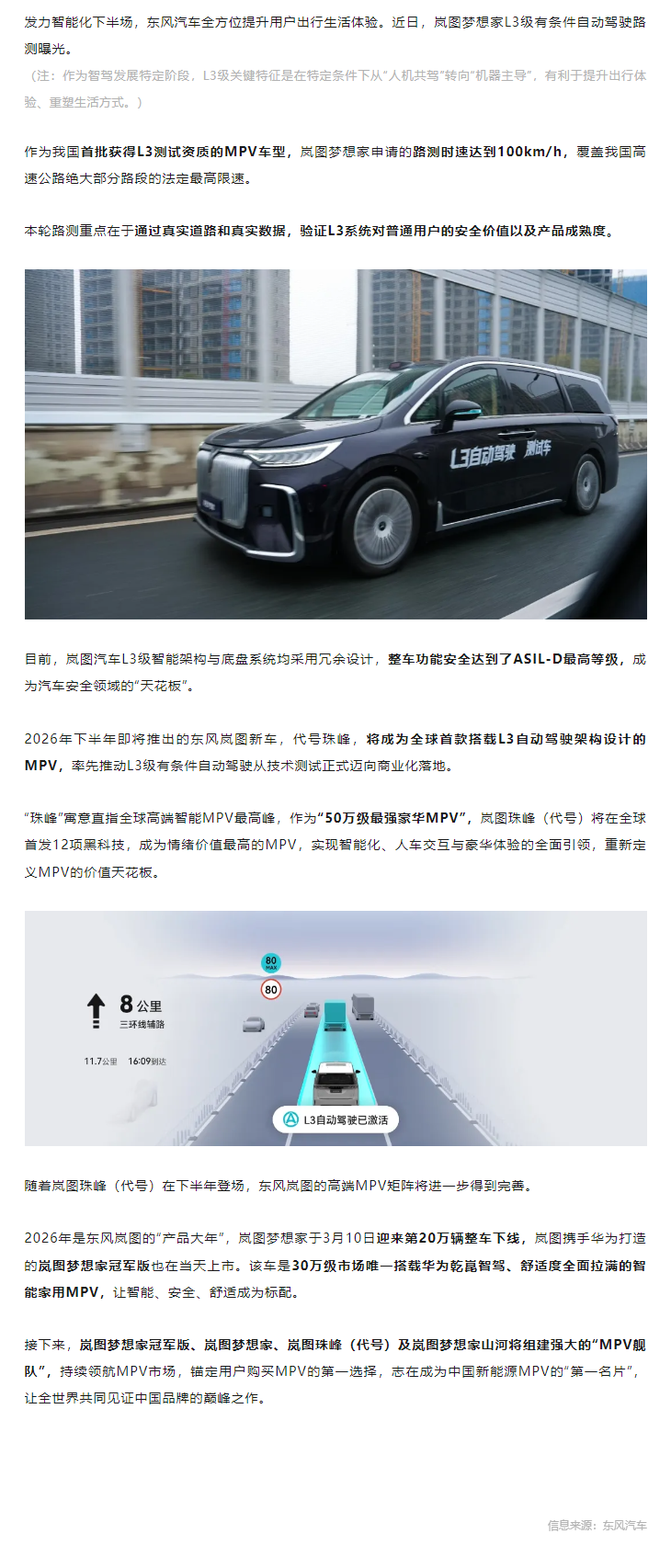 岚图L3级自动驾驶路测,将搭载于全新MPV车型