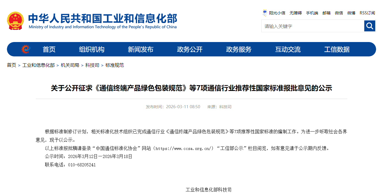 根据标准制修订计划,相关标准化技术组织已完成通信行业《通信终端产品绿色包装规范》等7项推荐性国家标准的编制工作。为进一步听取社会各界意见,工业和信息化部科技司现予以公示。
