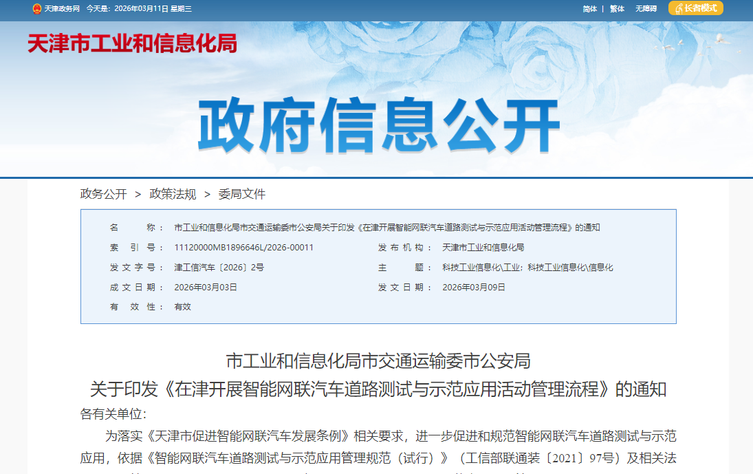 天津市工业和信息化局、市交通运输委、市公安局(以下简称“三部门”)联合发布《在津开展智能网联汽车道路测试与示范应用活动管理流程》,明确: