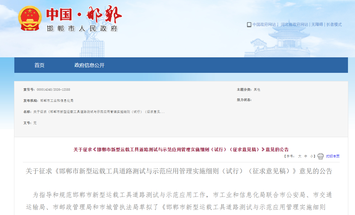 为加快新型运载工具技术研发应用,指导和规范邯郸市新型运载工具道路测试与示范应用,邯郸市工业和信息化局联合市公安局、市交通运输局、市邮政管理局和市城管执法局草拟了《邯郸市新型运载工具道路测试与示范应用管理实施细则(试行)(征求意见稿)》,现征求社会各界意见。