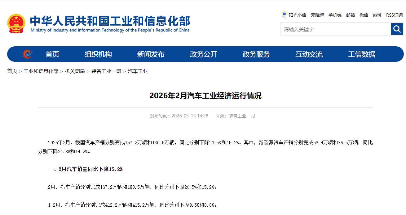 工业和信息化部装备工业一司发布2026年2月汽车工业经济运行情况。