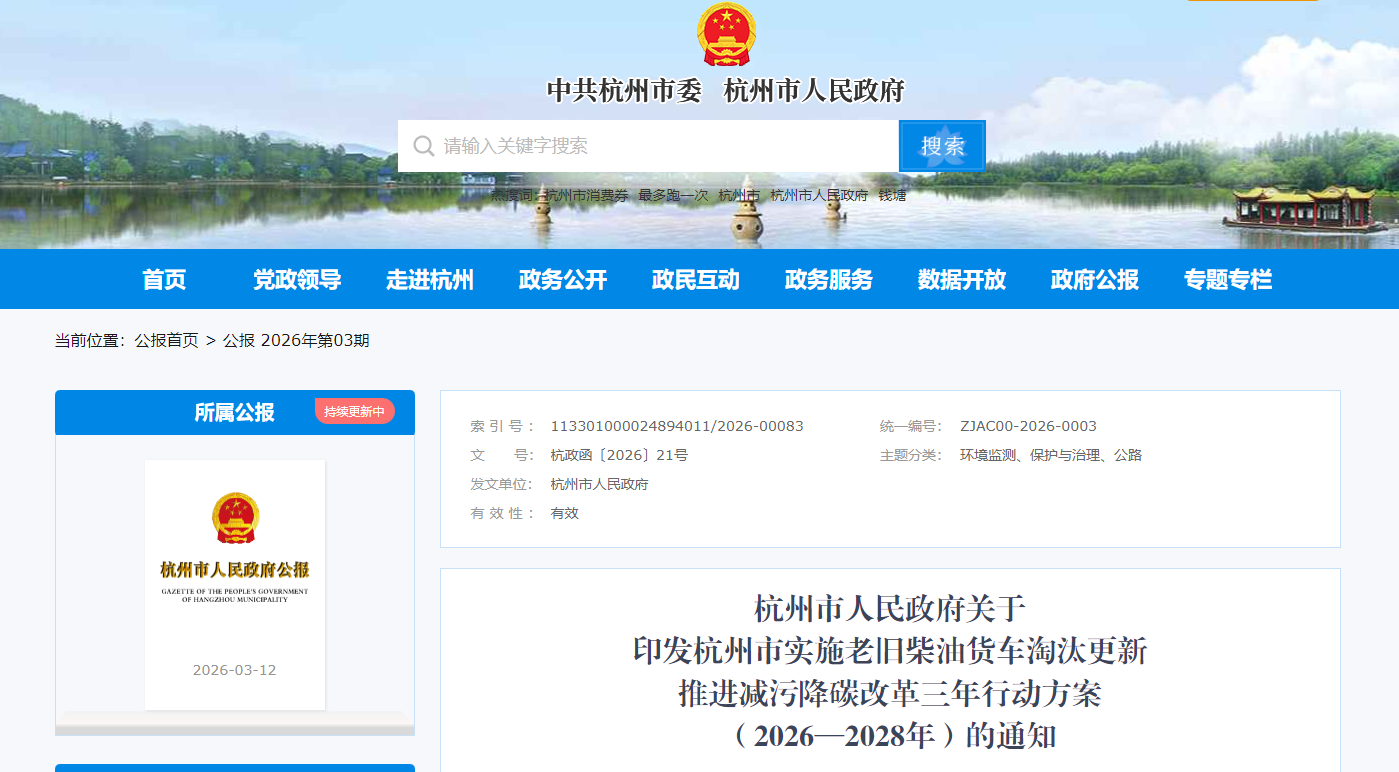 为进一步优化我市交通运输结构,深化减污降碳改革,推进市区老旧柴油货车新能源替代,持续改善区域大气环境质量,加快建设更高水平美丽杭州,根据《杭州市大气污染防治规定》和省、市相关文件精神,杭州市人民政府制定《杭州市实施老旧柴油货车淘汰更新推进减污降碳改革三年行动方案(2026—2028年)》(以下简称《方案》)并于近日印发。《方案》明确: