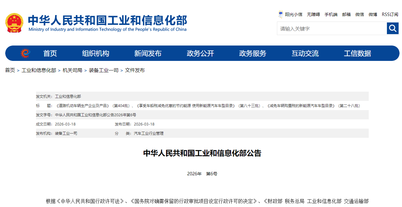 根据《中华人民共和国行政许可法》、《国务院对确需保留的行政审批项目设定行政许可的决定》、《财政部 税务总局 工业和信息化部 交通运输部关于节能 新能源车船享受车船税优惠政策的通知》(财税〔2018〕74号)、《工业和信息化部 财政部 税务总局关于调整享受车船税优惠的节能 新能源汽车产品技术要求的公告》(2025年第25号)、《财政部 税务总局 工业和信息化部 科技部关于免征新能源汽车车辆购置税的公告》(2017年第172号)、《财政部 税务总局 工业和信息化部关于延续和优化新能源汽车车辆购置税减免政策的公告》(2023年第10号)、《工业和信息化部 财政部 税务总局关于2026—2027减免车辆购置税新能源汽车产品技术要求的公告》(2025年第24号)等有关规定,现将许可的《道路机动车辆生产企业及产品》(第404批)以及经商国家税务总局同意的《享受车船税减免优惠的节约能源 使用新能源汽车车型目录》(第八十三批)、《减免车辆购置税的新能源汽车车型目录》(第二十八批)予以公告。