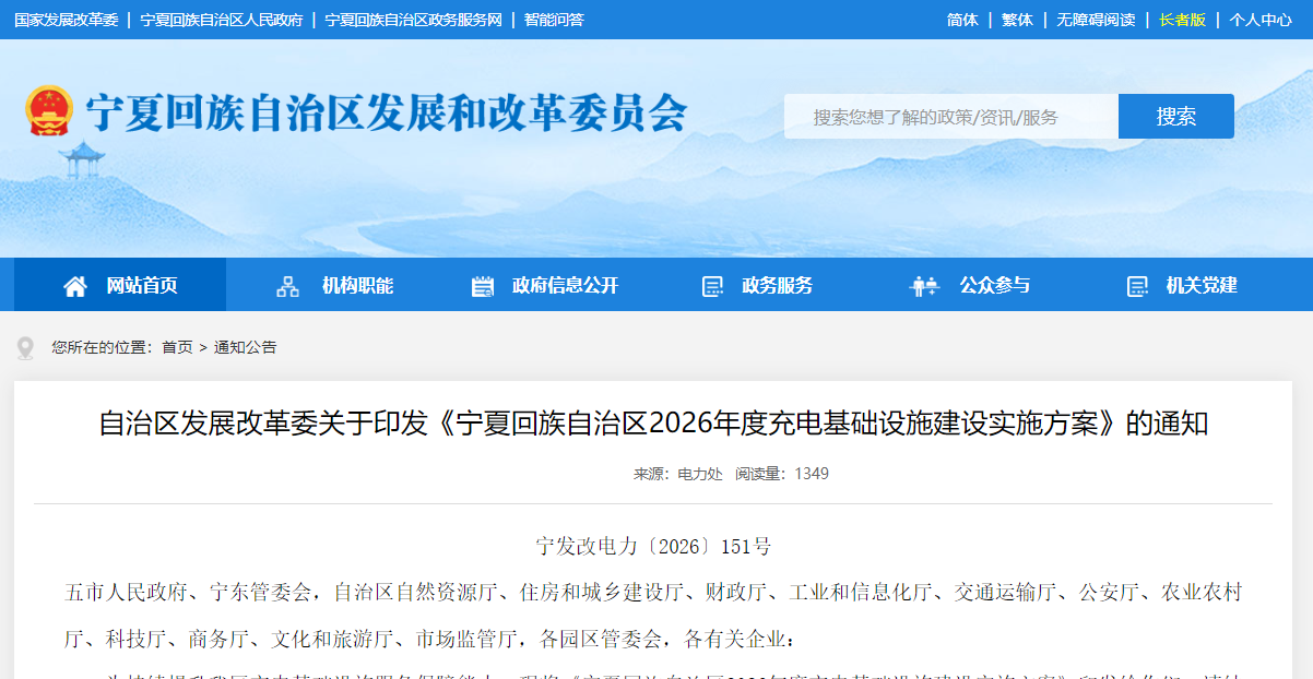 为贯彻落实相关文件精神,持续提升充电基础设施服务保障能力,促进电动汽车更大范围内购置使用,结合本区实际,宁夏回族自治区发展和改革委员会委制定《宁夏回族自治区2026年度充电基础设施建设实施方案》(以下简称《方案》)并于近日印发。《方案》明确: