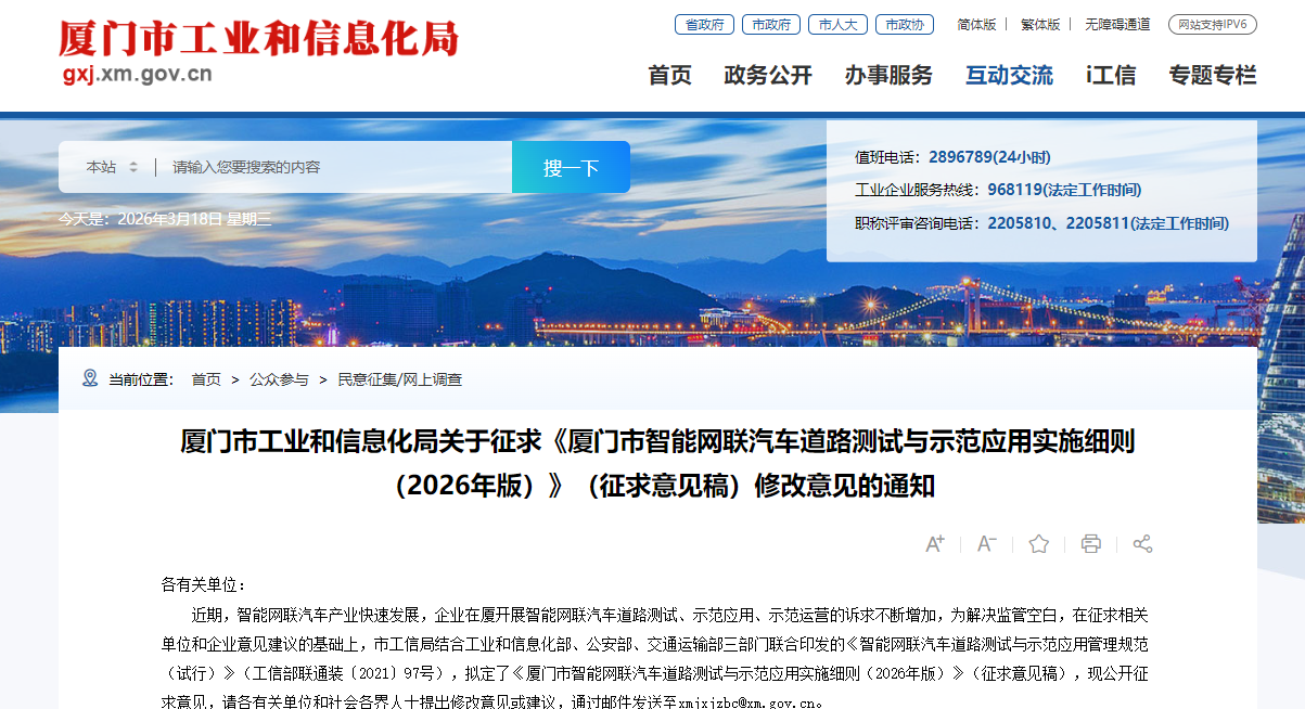 智能网联汽车产业快速发展,为发展智慧交通,加快推动汽车智能化、网联化技术应用和产业发展,指导和规范厦门市智能网联汽车道路测试、示范应用、示范运营工作,厦门市工信局结合《智能网联汽车道路测试与示范应用管理规范(试行)》,拟定了《厦门市智能网联汽车道路测试与示范应用实施细则(2026年版)(征求意见稿)》并于近日发布。