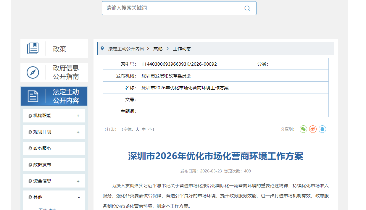 为深入贯彻落实习近平总书记关于营造市场化法治化国际化一流营商环境的重要论述精神,持续优化市场准入服务,强化各类要素供给保障,营造公平良好的市场环境,提升政务服务效能,进一步打造市场机制有效、政府服务到位的市场化营商环境,深圳市发展和改革委员会制定《深圳市2026年优化市场化营商环境工作方案》(以下简称《方案》)并于近日发布。《方案》明确: